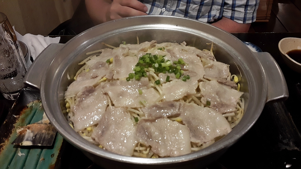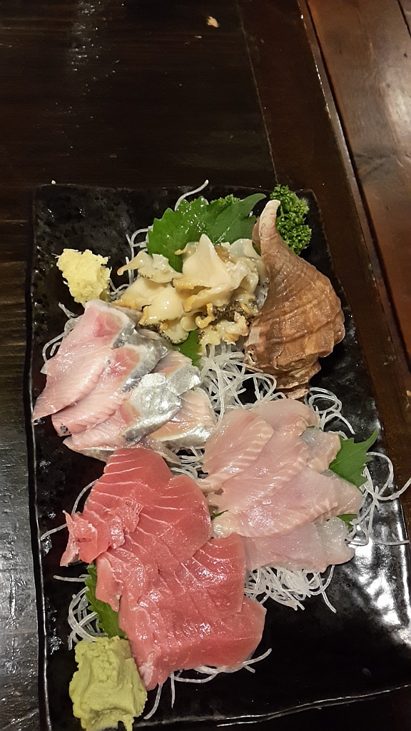 Unser Essen bestand aus Sashimi, Okonomiyaki und einem Eintopf mit Speck und Bambus-Sprossen.