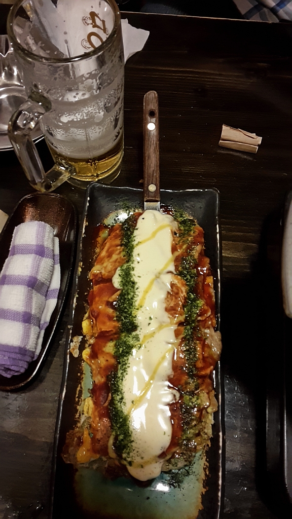 Also, mit einem größeren Umweg über eine Bank bzw. deren Geldautomaten (gefunden haben wir einen ATM in einem Supermarkt), ging es in besagte Strasse. Wir wurden dort von einem Herren angesprochen, der uns von leckere Okonomiyaki erzählte (die japanische Pizza, die wir in Kyoto und Hiroshima so geliebt haben) – also rein mit uns.