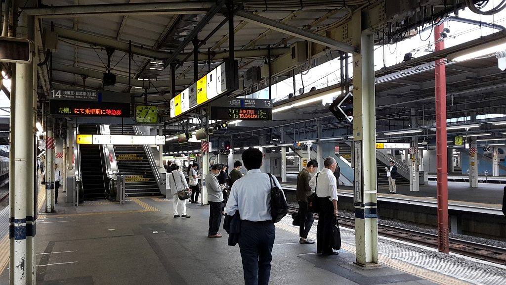 Mit der Yamanote ging es erst einmal nach Shiragawa, von wo aus wir mit dem Narita Express zum Flughafen fahren wollten. Auf unserem Bahnsteig kamen allerdings vorher (s. Anzeigetafel) noch einige Züge vorher. Und da kamen Menschenmengen raus, dass man Angst hatte, von ihnen vom Bahnsteig in Richtung Ausgang mitgezogen zu werden.