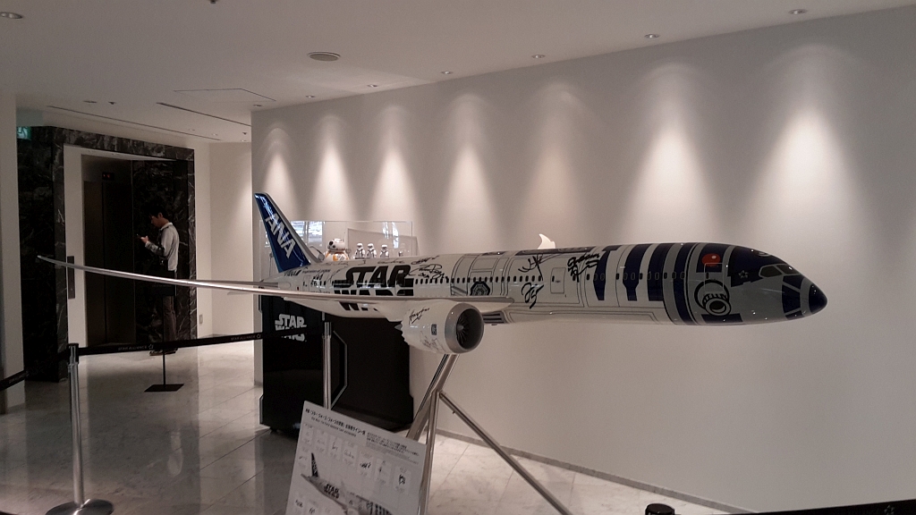 Pünktlich zum Boarding machten wir uns auf den Weg zum Gate, nicht ohne vorher dieses Modell des ANA Dreamliners mit StarWars Lakierung und vielen Unterschriften zu bewundern.