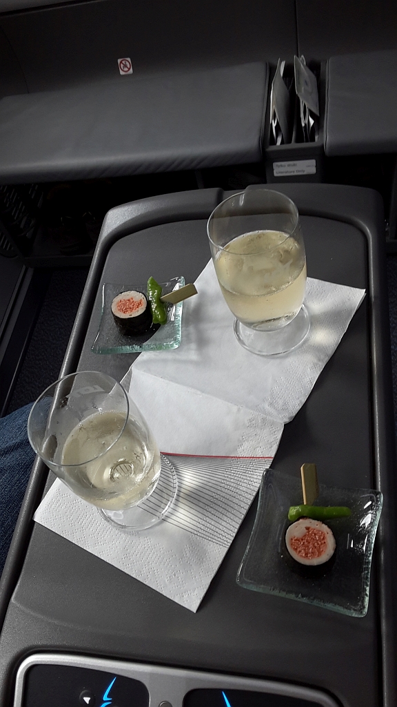 Der Start war ohne Besonderheiten (ausser, dass wir es immer noch toll finden, wenn sich die Bodencrew in eine Reihe stellt und verbeugt, wenn das Flugzeug losrollt) und schon begann das Fressen.
