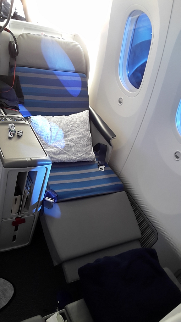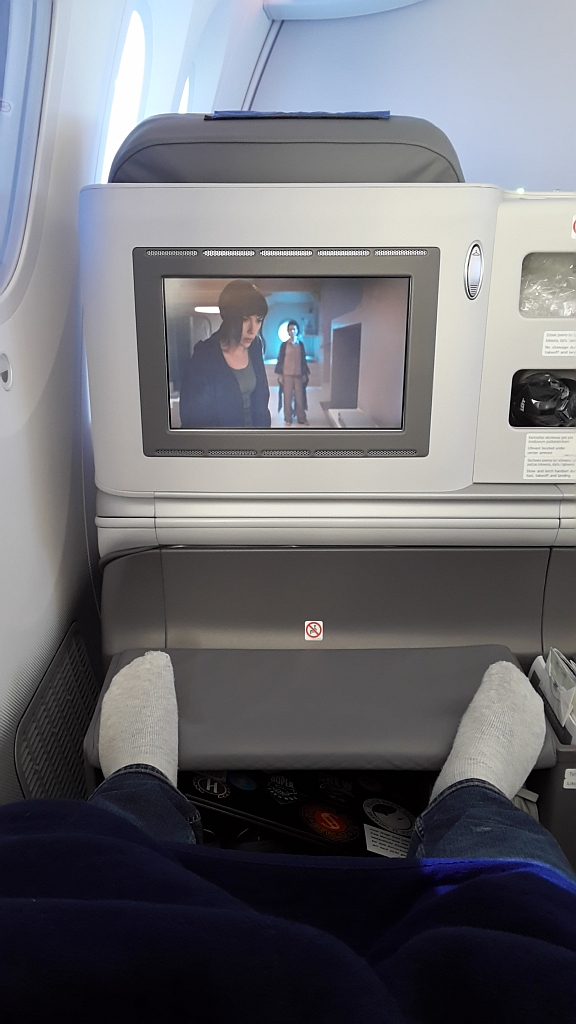 Danach haben wir probiert etwa zu schlafen. Die Fenster im Dreamliner sind allerdings elektronisch gesteuert und können „nur“ verdunkelt werden. Was, wenn man wie Jens, direkt am Fenster auf der Sonnenseite liegt, dazu führt, dass es hell ist.