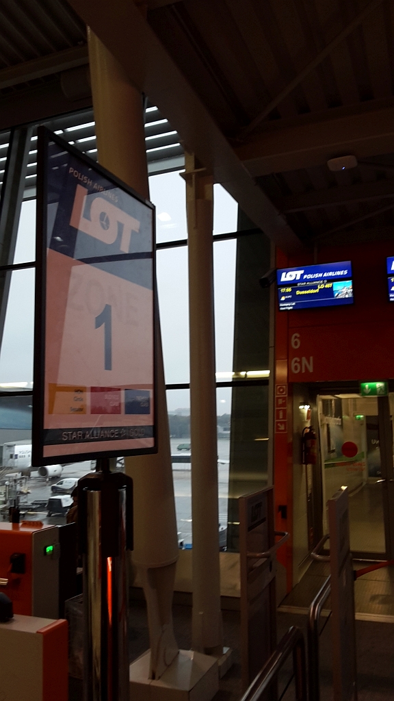 Am Gate angekommen: Viele Polen (deren Fähigkeiten in der Schlange zu stehen und auf Ansagen zu achten, der des durchschnittlichen Deutschen entspricht) und ein paar Japaner. Letztere sagten dann, dass das Boarding was später stattfindet.