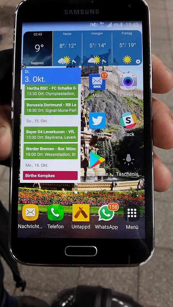 Eine positive Überraschung war übrigens, dass in Düsseldorf auf einmal Jens Handy wieder ging. Keine Ahnung warum, denn seit Japan reagierte das Display nicht mehr, was die Eingabe des Entsperrmusters unmöglich gemacht hat. Aber auf dem Bahnsteig am Flughafenbahnhof ging es wieder. Und so konnte Jens dann die angefallenen WhatsApps auf der Heimfahrt im RE1 lesen.
