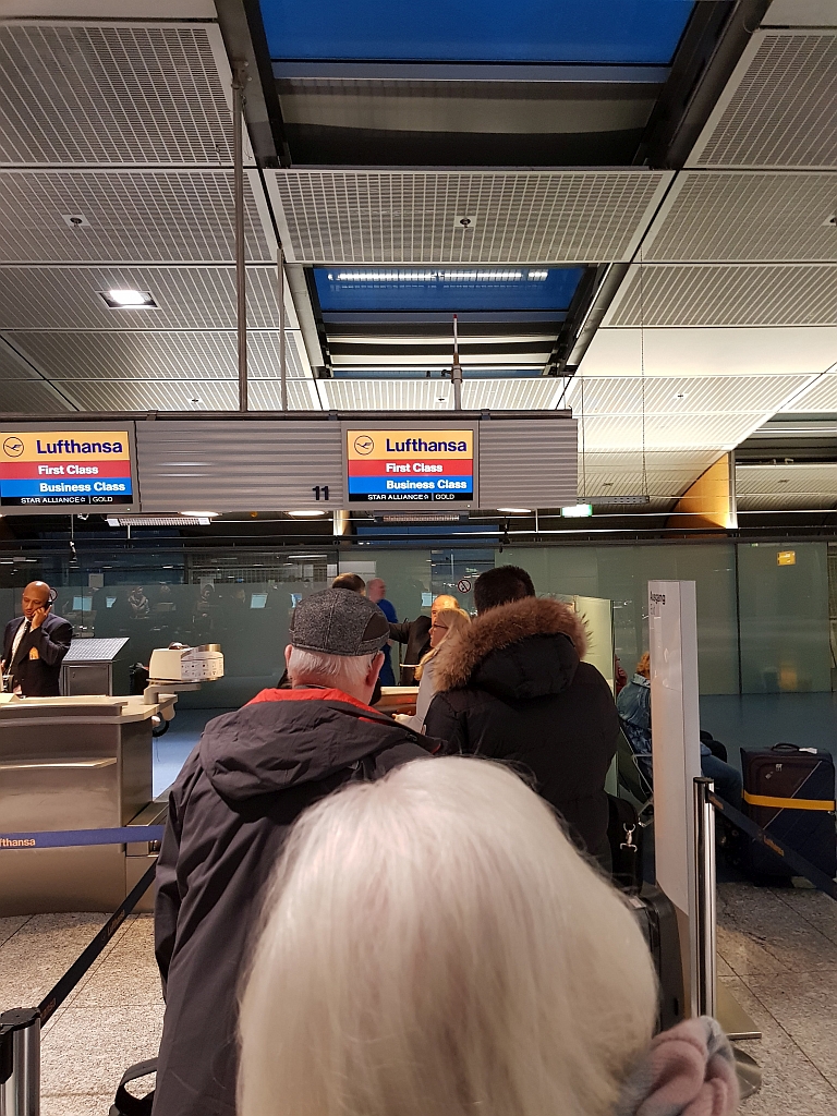 Mit unserem Status (StarAlliance Gold) können wir auch am Business-Schalter einchecken, was heute nicht der große Vorteil war, denn die Leute vor uns hatten komplizierte Buchungen. Und einen redseligen Lufthansa-Angestellten vor sich.