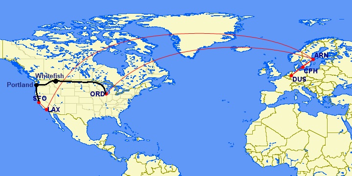 Die Route ist auch dieses mal nicht … einfach. Es geht mit SAS via Stockholm nach Chicago. Von dort aus fahren wir mit dem Zug nach Whitefish. Von Whitefish aus fahren wir mit Markus nach Portland. Von dort geht es wieder mit dem Zug weiter nach San Francisco. Und dann (durch einen buchungstechnischen Fehler unsererseits) mit einem kleinen Hüpfer von San Francisco nach Los Angeles (Flug mit United) und dann via Stockholm und Kopenhagen wieder nach Düsseldorf.