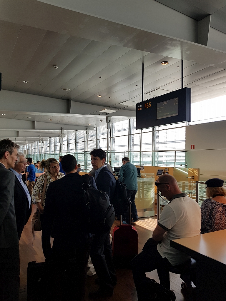 Am Gate gab es dann noch etwas Verwirrung, denn bevor wir zu Gate F64 gehen durften, mussten wir zu Gate F63 (gegenüber) und einige Fragen über unser Gepäck beantworten und so einen Stempel erhalten, der uns wiederum den Weg zum eigentlichen Gate ermöglichte. Verstehe wer will.