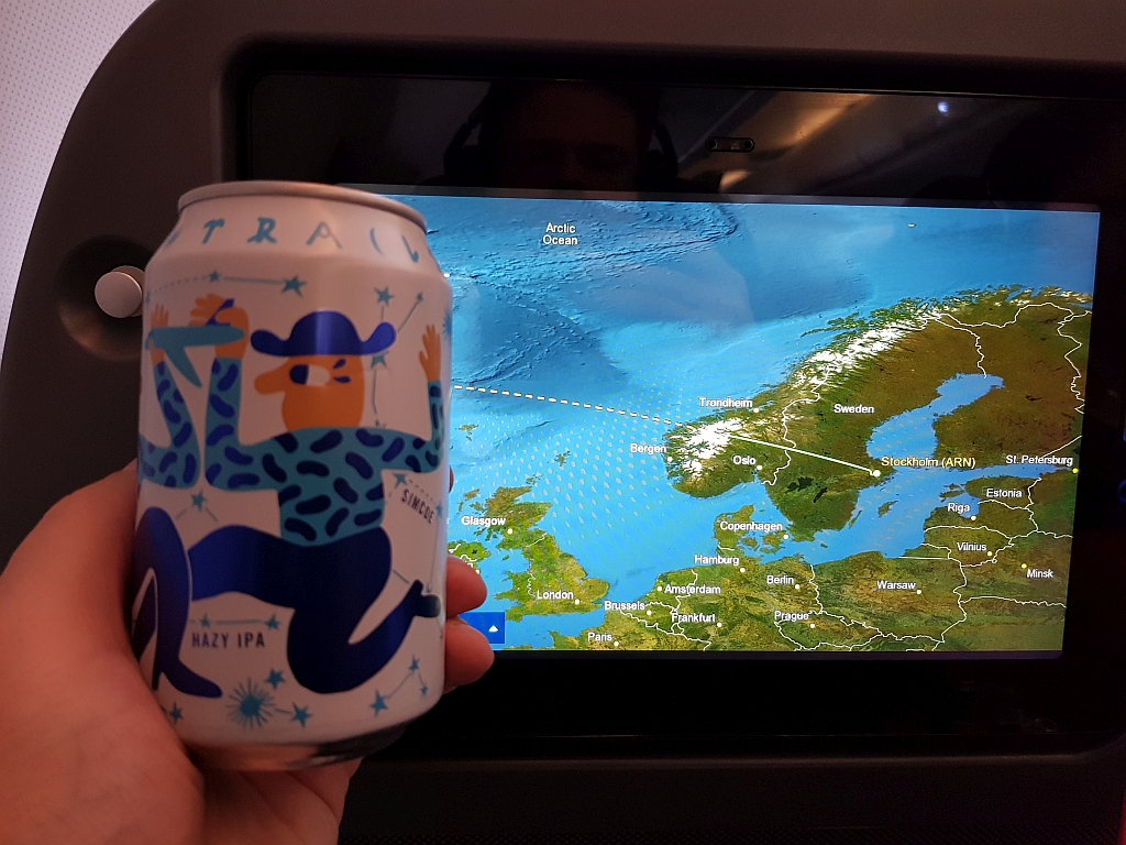 Kurz hinter Norwegen hatten dann auch die Turbulenzen ein Ende und so konnten mehrere Dinge gleichzeitig beginnen: Der Getränkeservice und das gratis Internet für die Business- und Premium Economy (Economy muss zahlen). Und so konnten wir wieder mit untappd (unserem Facebook für Craft-Beer-Fans) einen CheckIn mit dem von Mikkeller für SAS gebrauten IPA machen. In 10 Kilometern Höhe. Super!