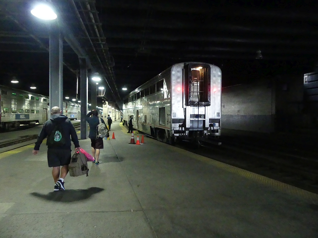 Aber nach etwa 10 Minuten durften wir auch zum Zug und hatten Glück. Der Empire Builder besteht aus zwei Teilen: Dem Zug Nummer 7, der von Chicago nach Seattle fährt und der Nummer 27, der von Chicago nach Portland fährt. Bis Spookane bleiben beide Teile zusammen und erst dort wird der Zug getrennt. Was bedeutet: Es gibt einen Teil #7 und einen Teil #27. Unser Zug war der letztere und das wörtlich, denn der letzte Wagen am Ende des Zuges war unser Schlafwagen.