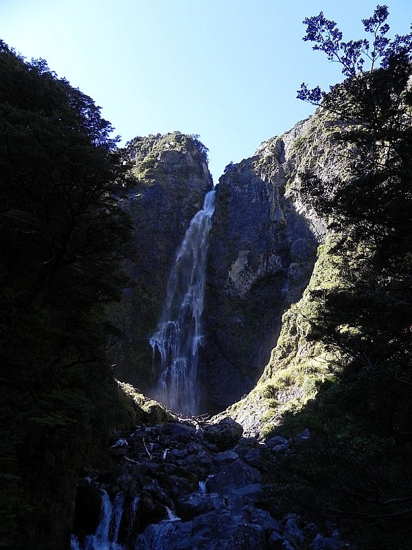 Über das, was wir hier machen können, haben wir uns vorher im Internet und in einer DOC-Broschüre informiert. Und aus den Möglichkeiten haben uns zwei Wanderwege interessiert, einer führte zum Devils Punchbowl Wasserfall, der andere zu den Bridal Veil Falls. Zu den Devils Punchbowls führt ein kurzer, aber sehr gemeiner Weg (800 Meter, 80 Höhenmeter!), der Anblick der Wasserfälle war aber die Mühen wert.