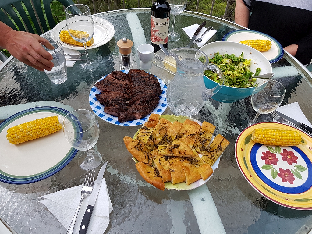 Leckeres Foccacia vom Bäcker gestern, ein schöner Salat, Maiskolben und ein wirklich, wirklich gutes Steak.