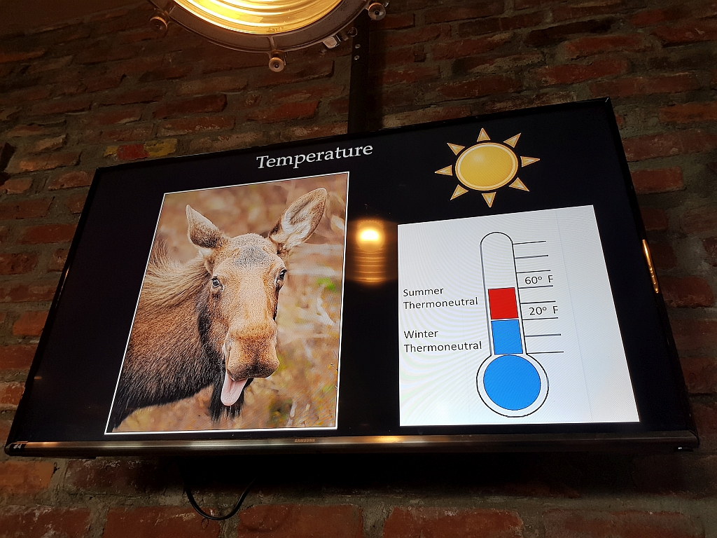 Witzig war, dass auf ein Mal die Musik ausgestellt wurde und die vielen Fernseher im Restaurant (die Baseball und Softball gezeigt hatten) auf eine PowerPoint Präsetation über Elche (!) umgeschaltet wurden.