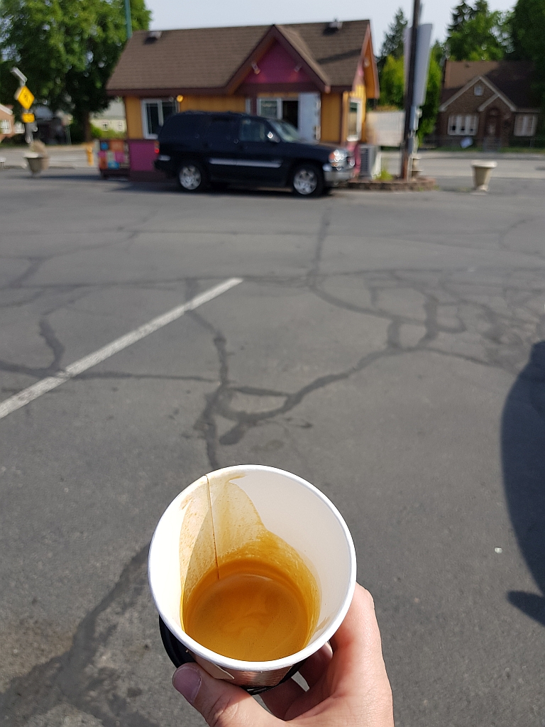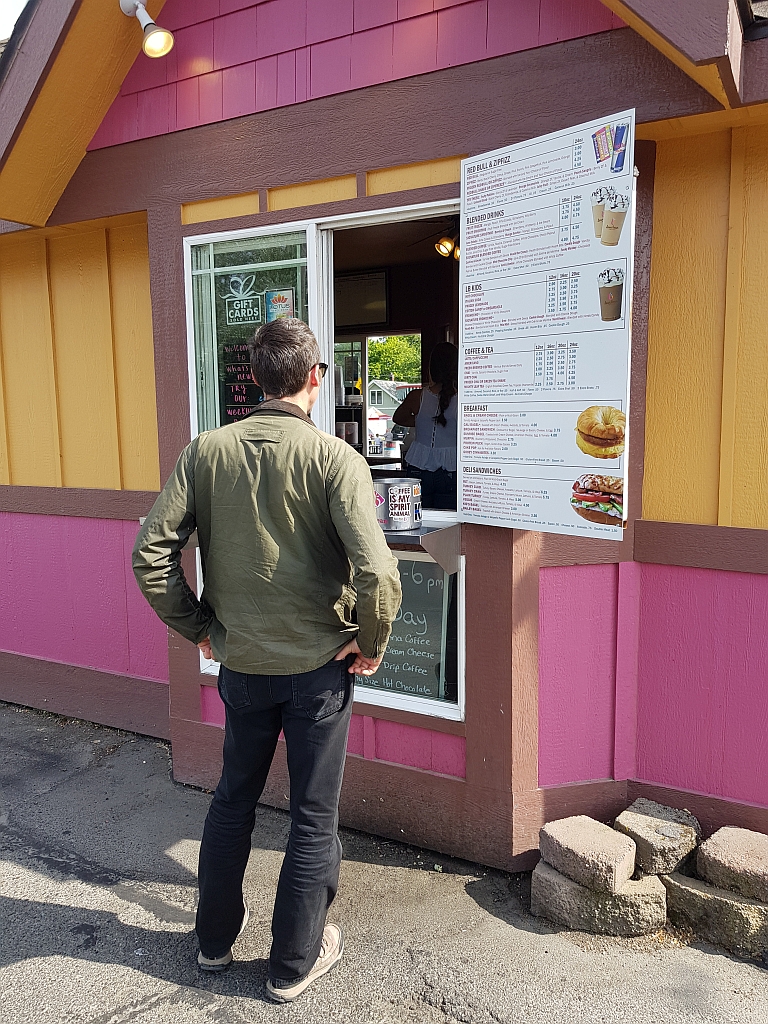 In den Orten gibt es häufig Drive-By Kaffee-Buden, wo man recht guten Kaffee oder Espresso bekommen kann. Man kann aber auch zu Fuß an den Schalter gehen, wenn man das nicht so ganz gerafft hat …