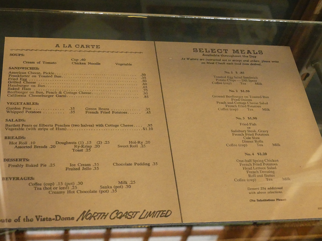 Noch ein weiteres Beispiel für die vielen interessanten Details: Die Speisekarte aus dem damaligen Paradezug der Pacific Northwestern zwischen Chicago und Seattle (mit einem Lewis & Clarke Themenwaggon) namens North Coast Limited.