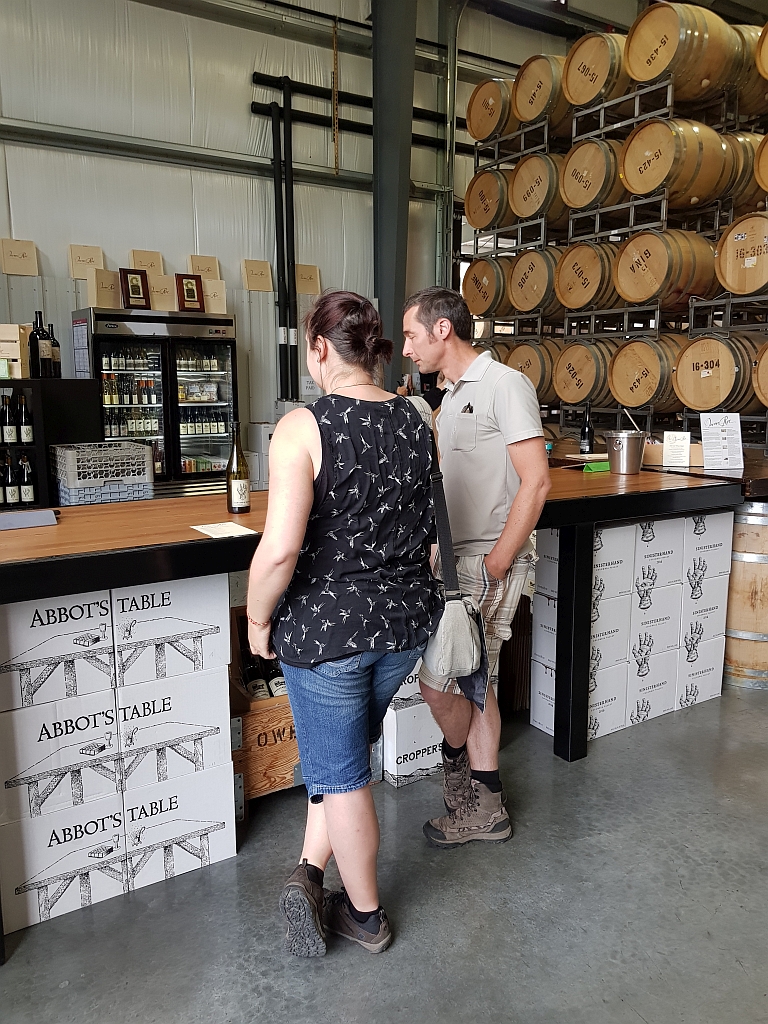 Wie so oft, wurde bei solchen kleineren Weinproduzenten die Lagerhallte gleich zum Tasting-Room „erweitert“, wobei hier der Personaleinsatz (es liefen 8 Leute herum) schon zeigte, dass hier schon mehr Publikumsverkehr erwartet wird.