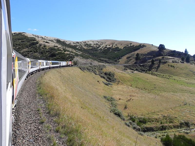 Um 7 Uhr fuhr der Zug pünktlich ab. Diese Strecke ist recht dürftig frequentiert, weswegen die neuseeländische Regierung auch versucht, die Werbetrommel für diese Züge zu rühren. Hoffen wir mal, dass es Erfolg hat, denn die Fahrt ist wirklich beeindruckend. Waren es gestern noch die Berge und Täler links und rechts der Strecke so sind es heute die Ebenen und die Küste, an der wir für 2 Stunden entlangfahren, die uns beeindrucken.