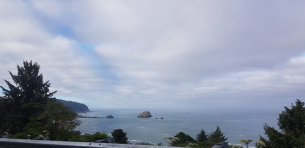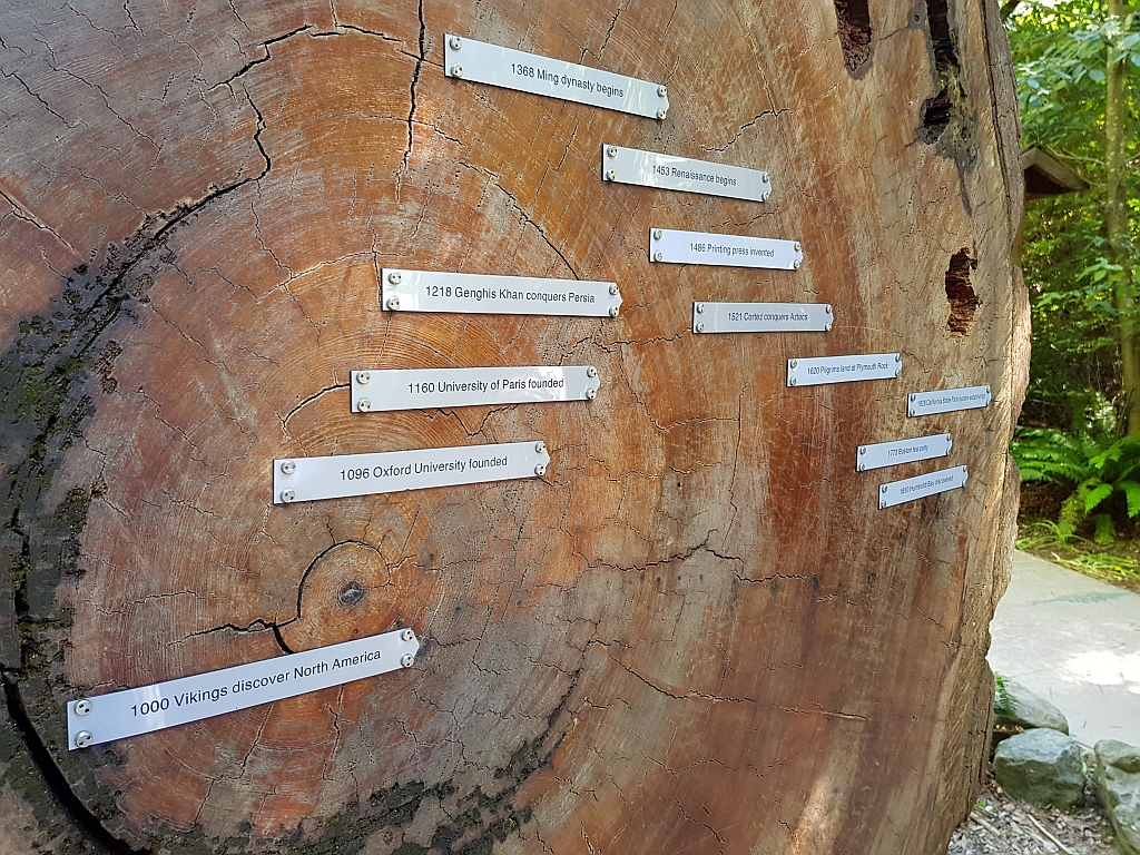 Hier haben wir uns was länger aufgehalten und die riesigen Bäume angeschaut. Ebenfalls hier zu finden ist der „Dyerville Giant“, der bis er in einem Sturm umgefallen ist, der größte Baum hier war. Der Baum war am Ende 60 Meter höher als die Niagara Fälle. Eine Scheibe dieses Baumes kann man am Visitor Center anschauen, schön dargestellt mit den Ereignissen an bestimmen Jahresringen. Beeindruckend, dass der Baum „geboren“ wurde, als die ersten Vikinger in Nordamerika aufgetaucht sind, so etwa um 1000 n.Ch. …