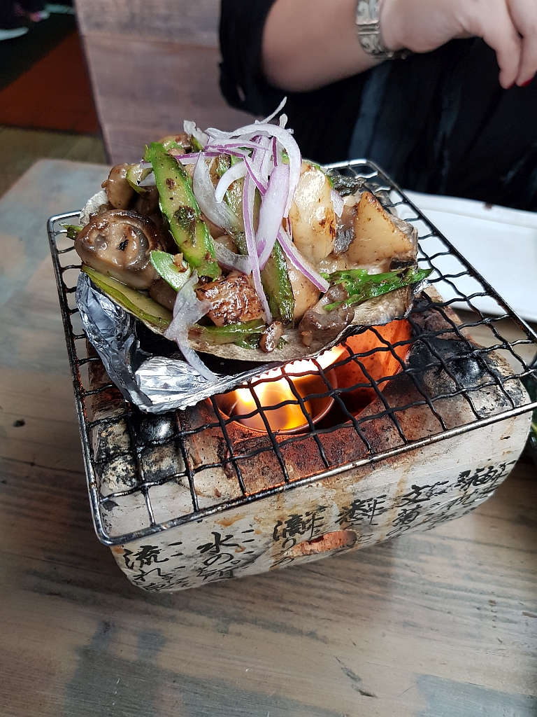 Zuerst: Hotate Yaki (gegrillte Jakobsmuschel mit Spargel und Pilzen in einer Buttersauce)