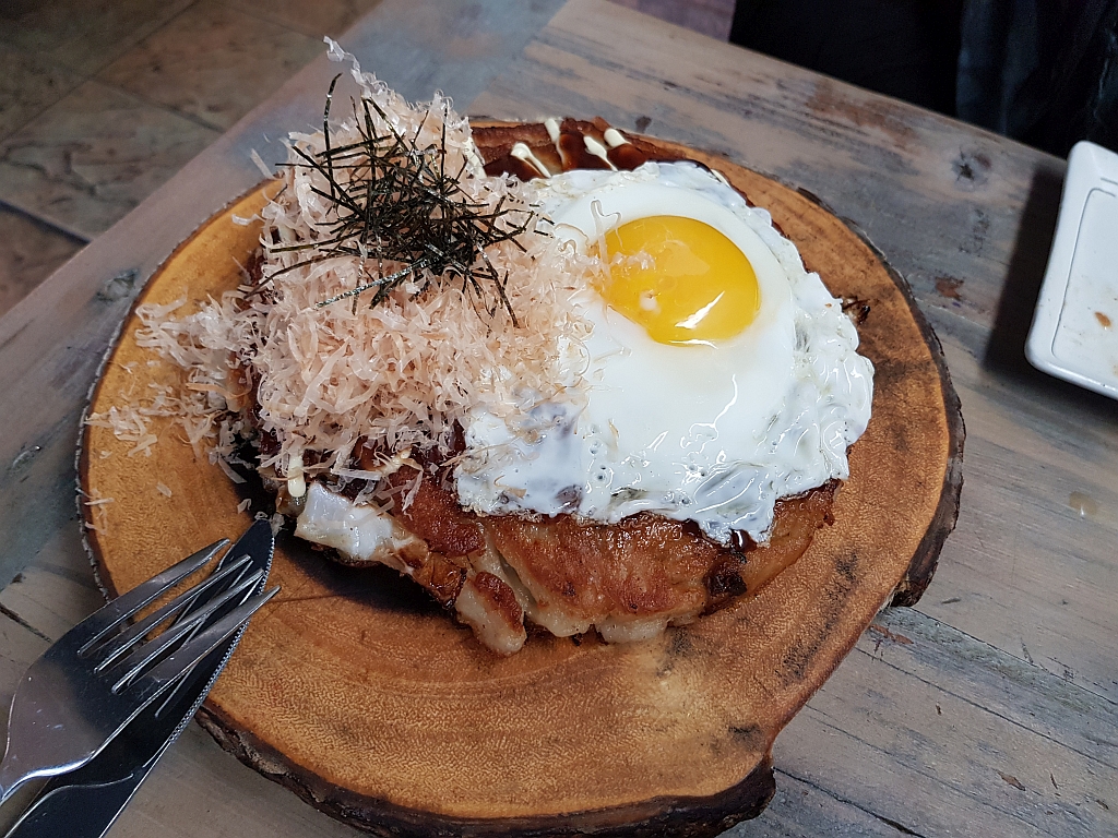 Okinomiyaki mit Spiegelei und Bonitaflocken