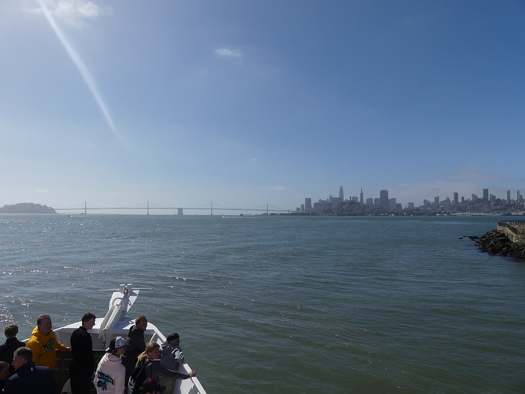 Die meisten haben sich tatsächlich ins Innere des Schiffes gesetzt – keine Ahnung warum. Das Wetter war super und von unserem Platz (2. Etage nach vorne heraus direkt an der Reeling) konnte man super das Gefängnis sowie die Golden Gate Bridge sehen. Sowie die sich entfernende Skyline von San Francisco.