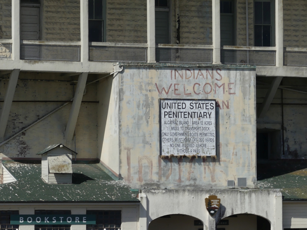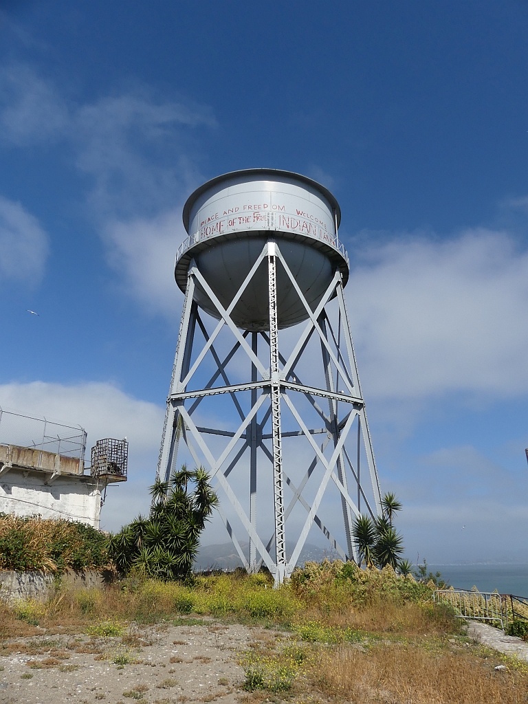 Auf dem Weg kommt man an diesem Wasserturm vorbei, der noch das Grafitti der Besetzung der Insel in den 60er Jahren. 1964 und 1969 bis 1971 besetzten Indianer die Insel, um gegen die unrechtmäßige Landnahme im vorhergehenden Jahrhundert zu protestieren. Die Besetzung wurde dann vom FBI unblutig beendet. Nette Geste: Als der Turm 2012 renoviert wurde, hat der National Park Service befür gesorgt, dass entweder die Besetzer von damals oder ihre Nachkommen die Inschriften und Slogans (z.B. „Peace and freedom“) wieder aufzutragen.