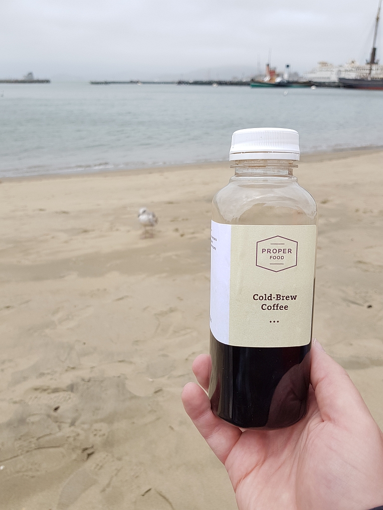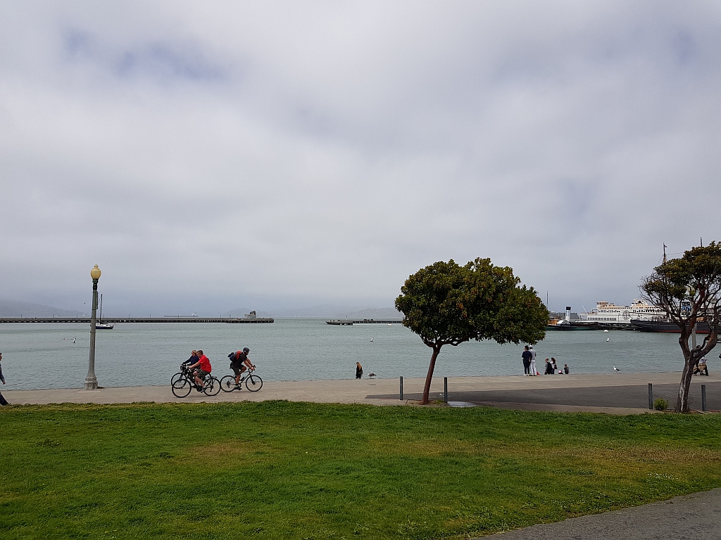 In einer Sandwich-Kette, die sich auf Bio-Produkte spezialisiert hat (nein, nicht Subways) haben wir Sandwiches und Getränke erstanden, die wir dann irgendwo verspeisen wollten. Dies allerdings nicht in der Innenstadt, wo wirklich jede Ecke mit Obdachlosen belegt ist. Also fuhren wir mit dem Streetcar entlang der Piers, was allerdings abrupt beendet wurde, da unser Streetcar defekt war. Und so ging es die letzten Meter zu Fuß bis zum Maritime National Park, einem kleinen Park hinter dem Fishermens Wharf. Dort setzten wir uns an den Strand und aßen etwas. Und tranken Kaffee (also Jens).