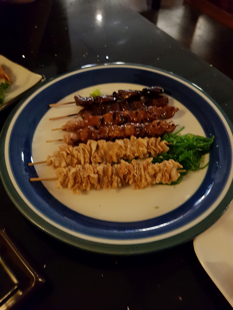 Gegrillte Spiesse: Bauchfleisch, Hühnerhaut, Hüherfilet und Hühnerherzen: