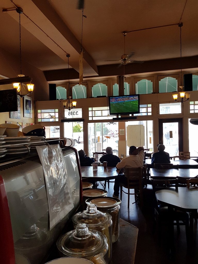 Wir sind die Wartezeit lieber nebenan in ein Cafe gegangen, denn dort gab es einerseits halt Kaffee und andererseits hörte man Fussballgeräusche.