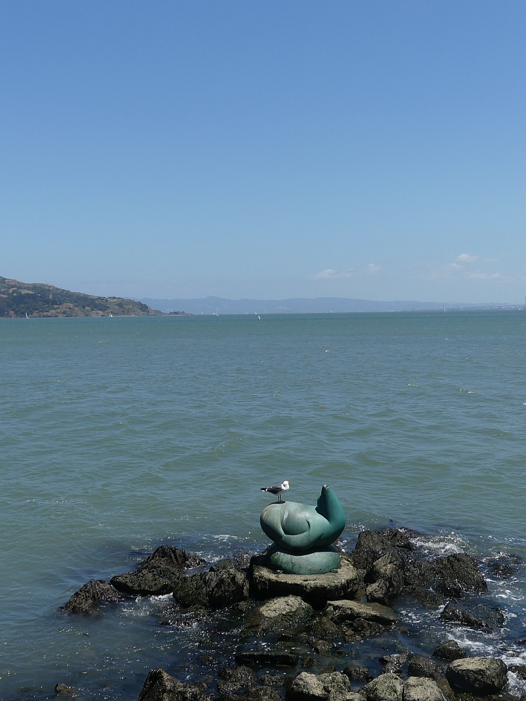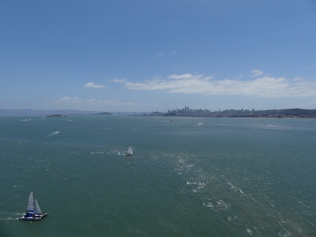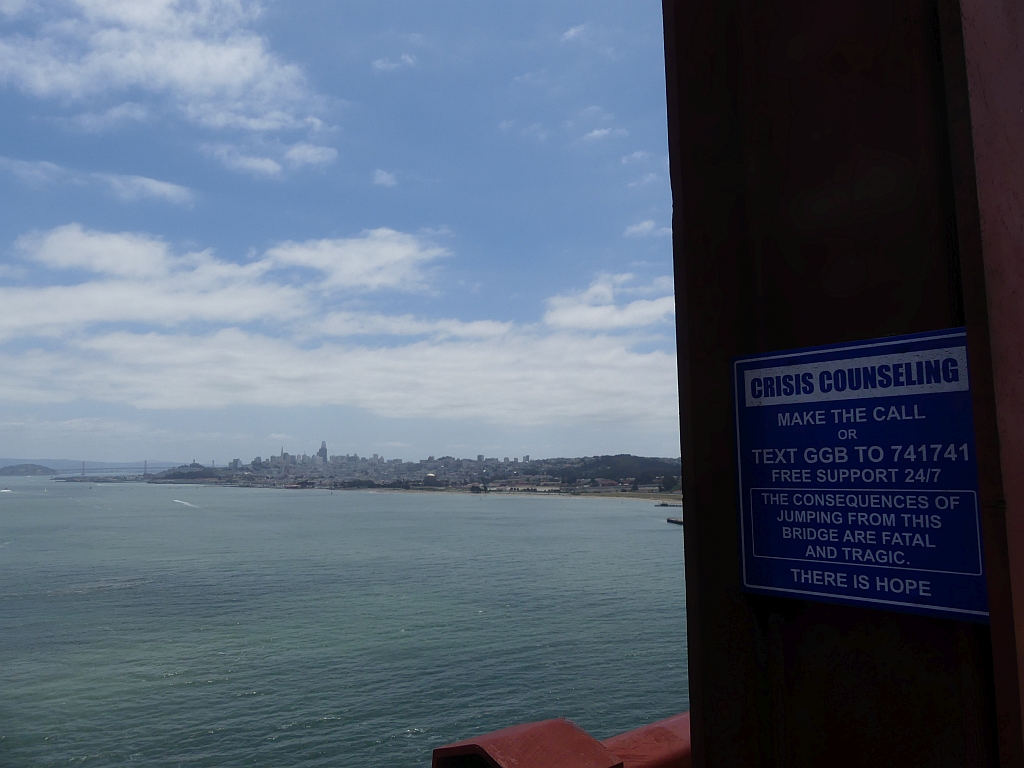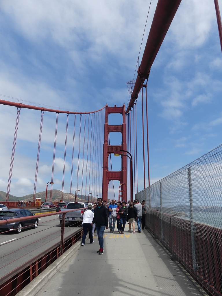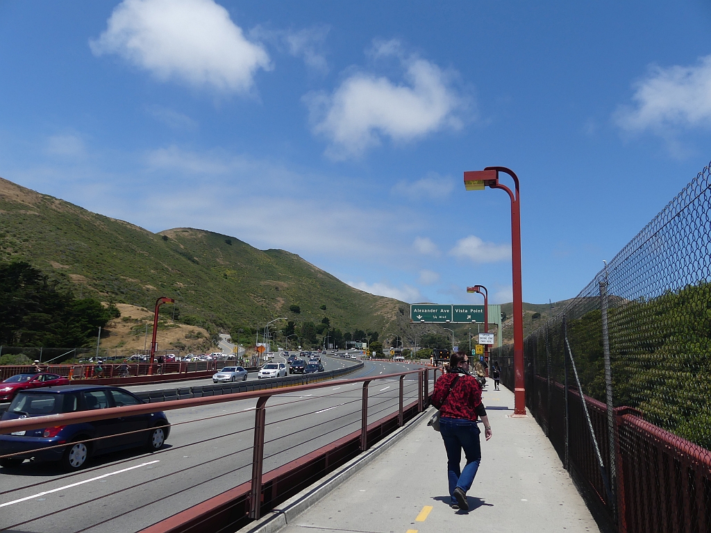 Angesichts des schönen Wetters haben wir uns, wie schon gesagt, spontan zu einem Spaziergang entschlossen. Also rauf auf die Brücke, wo heute (im Gegensatz zu anderen Tagen) die der Stadt zugewandte Seite nur für Fussgänger geöffnet war. Fahrradfahrer mussten auf der anderen Seite ohne Blick auf San Francisco fahren. Schlecht für sie, gut für uns, denn so musste man nicht besonders aufpassen.