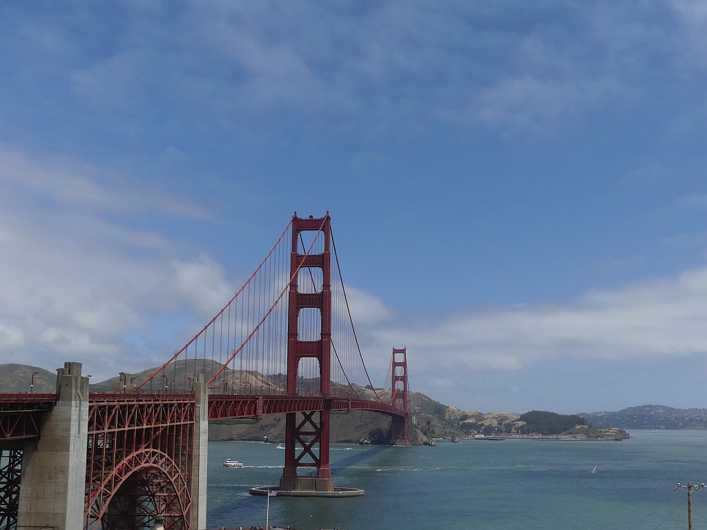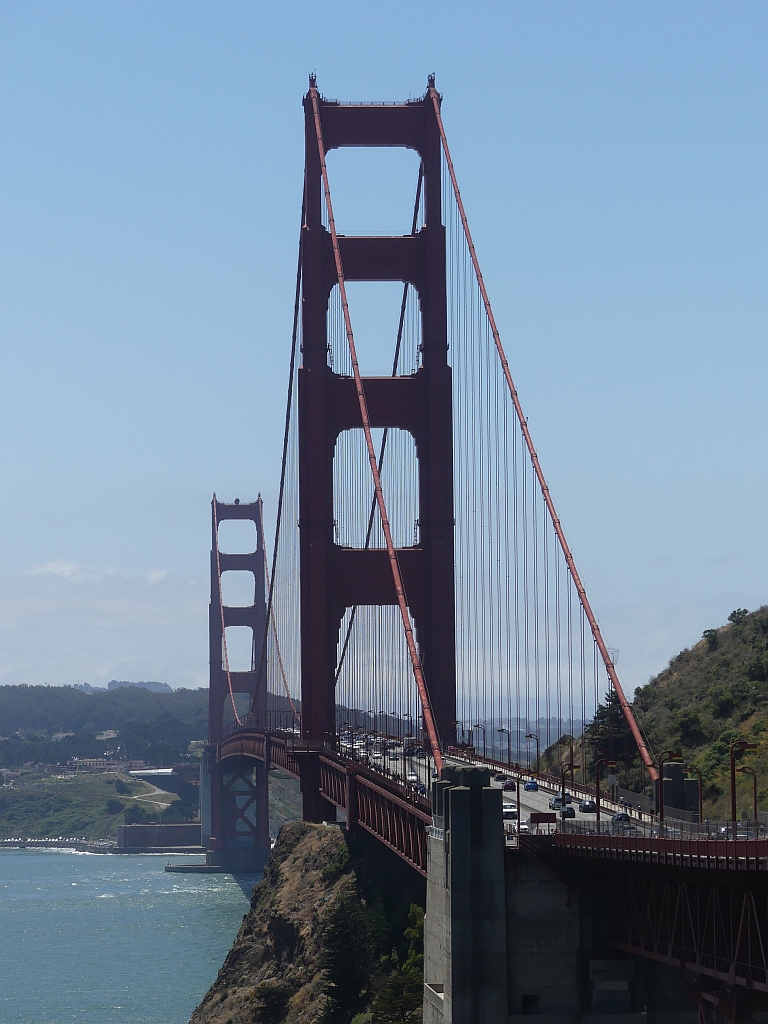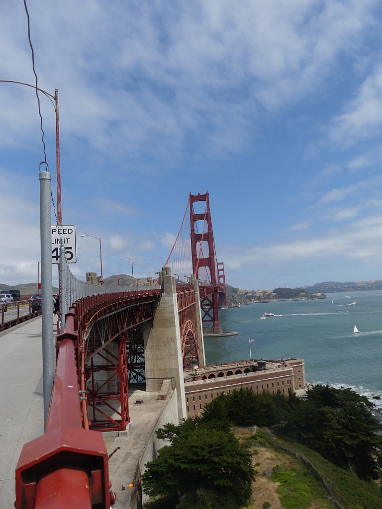 Nun was technisches zur Brücke: Die Golden Gate Bridge war bei ihrer Eröffnung 1937 mit einer Hauptstützweite von 1280 Metern die längste Hängebrücke der Welt. 27 Jahre später wurde sie dann abgelöst, aber selbst heute gehört sie zu den längsten Hängebrücken weltweit. Der ganze Brückenzug ist inklusive der Zufahrtsbrücken 2737 Meter lang. Die eigentliche Hängebrücke hat eine Gesamtstützweite von 1966 Metern und weist 227 Meter hohe Pylone auf. Bei Flut steht das Wasser 67 Meter unter der Brücke, also genug für die Schiffe nach San Francisco oder Oakland.