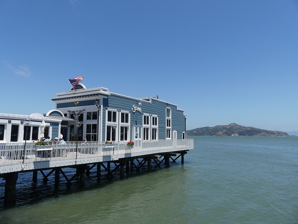 Für Fußgänger ist hier ja eher selten gesorgt und so mussten wir ständig auf Autos, Busse und Fahrräder (Touris und „sportliche Fahrer) achten bzw. ausweichen. Und die Hitze tat ihr übriges dazu. Aber die knappen 2 Kilometer gingen dann auch vorbei und schon waren wir in Sausalito, einer kleinen Stadt quasi gegenüber von San Francisco.