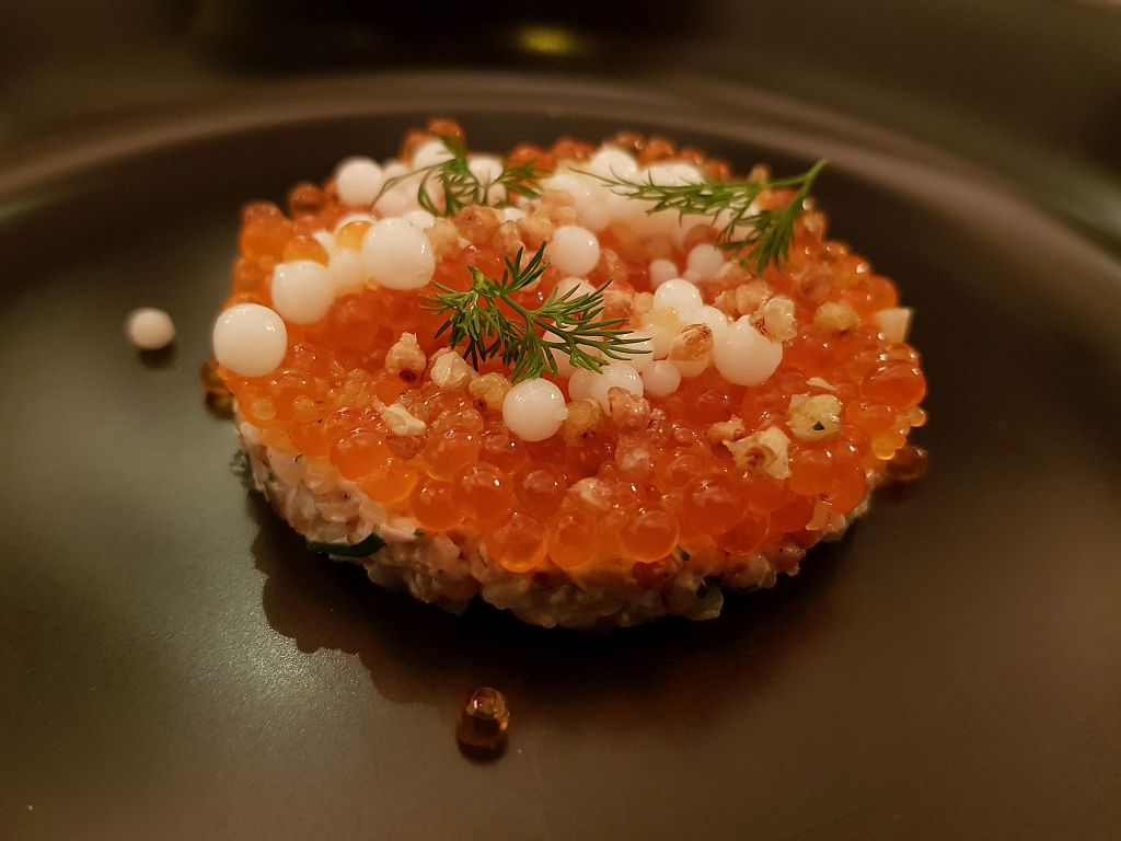 Dann noch ein Highlight: Buchweizen, einmal gebraten, einmal als Gel-Kugeln mit Fischrogen. Sehr, sehr gut!