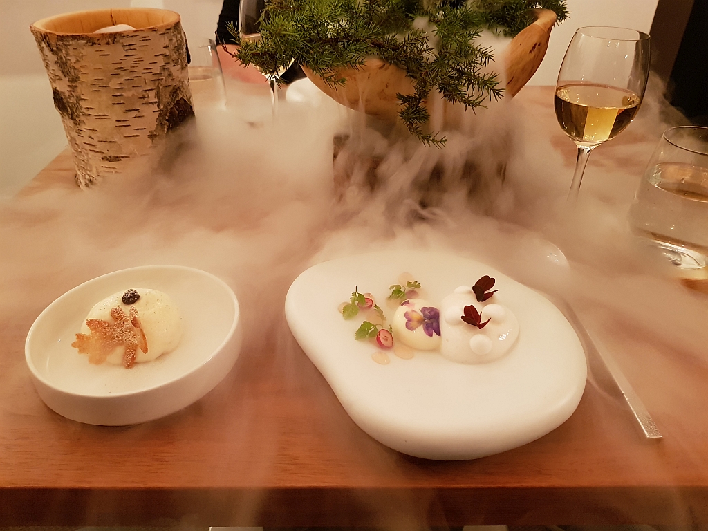 Und dann noch der … spektakuläre Abschluss: In einer Schüssel mit Tannenzweigen wurde Trockeneis mit einem Tee-Aufguss freigesetzt und bot so den Rahmen für die „Drunk Berries“, die Quarkspeise und die Rhabarber Nachspeise.