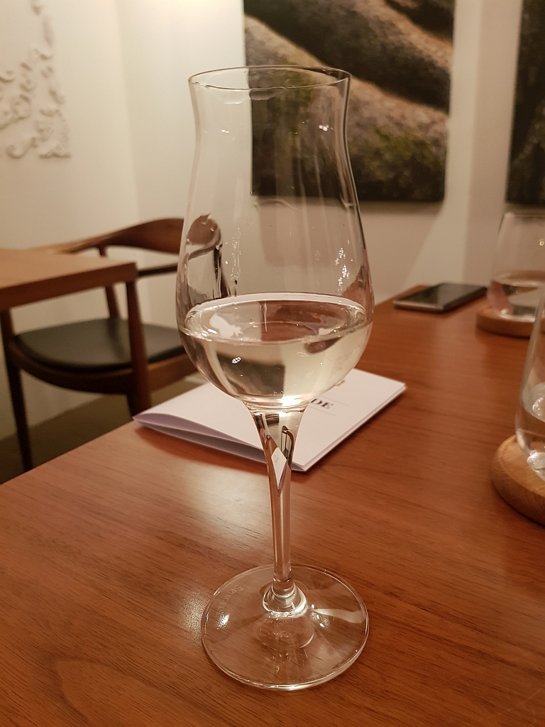Zu den Gerichten hatten wir die „Getränke-Begleitung“ mitbestellt. Nicht, wie sonst üblich, eine Wein-Begleitung. Der Grund dafür liegt daran, dass eben auch andere Getränke, wenn es passte, zu den Gängen gereicht wurden.