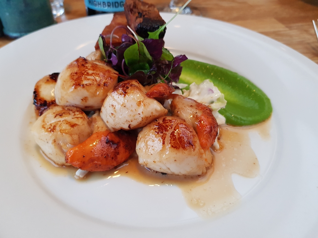 Also Hauptgang gab es dann Muscheln mit Krebs für Meike und Jakobsmuschen mit Schweinebauch für Jens. Tatjana und Thomas nahmen jeweils einen weiteren Vorspeisenteller (Lachs) als Hauptgang. Waren ja auch noch nicht so oft in Schottland und ihre Mägen müssten sich noch hieran gewöhnen … 😉