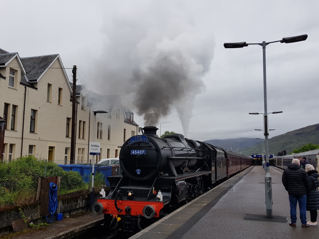 Einmal natürlich der Jacobite (aka „Harry-Potter-Zug“), der unter Dampf steht und gleich abfährt.