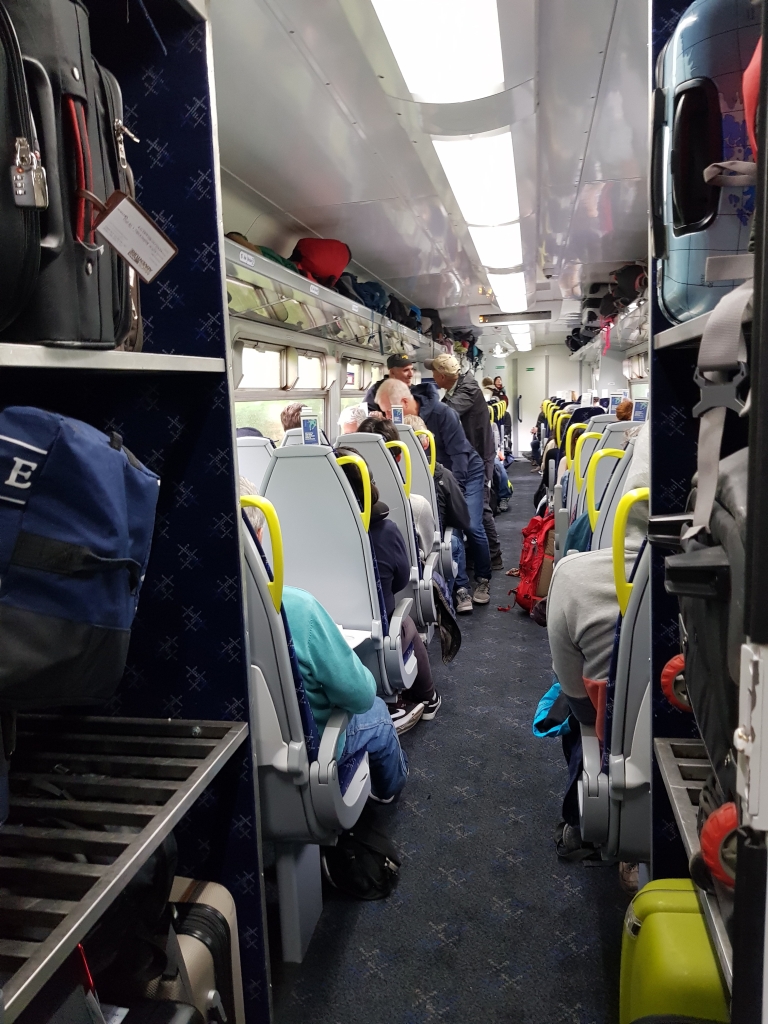 Aber unseren Wagen „D“ fanden wir, unsere Koffer hatten auch einen Platz. Wenn auch im Falle von Tatjana und Thomas als Teil eines großen Haufens an einem Ende des Zuges. Was witzig wurde, als der Verpflegungs-Trolley durchfahren musste und erst einmal eine Schneise in die Taschen, Koffer, Rucksäcke und wassonstnoch räumen musste.