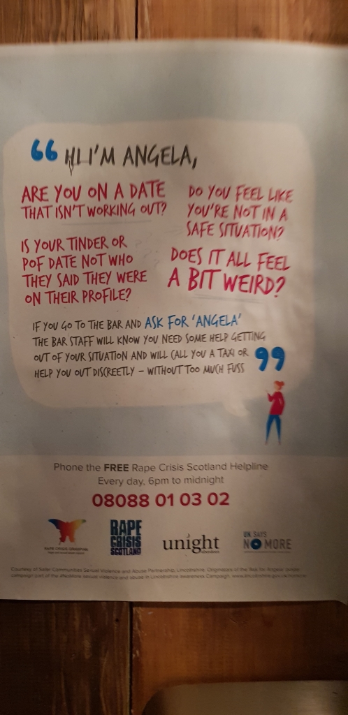 Ach so, eine Sache ist uns noch aufgefallen: Eine eigentlich total einfach Idee, die in Schottland gerade eingeführt wurde. Wenn man in einer Bar bedrängt wird oder von jemandem belästigt wird, kann man sich einfach Hilfe holen, indem man zu Bar geht und einfach nach „Angela“ fragt.