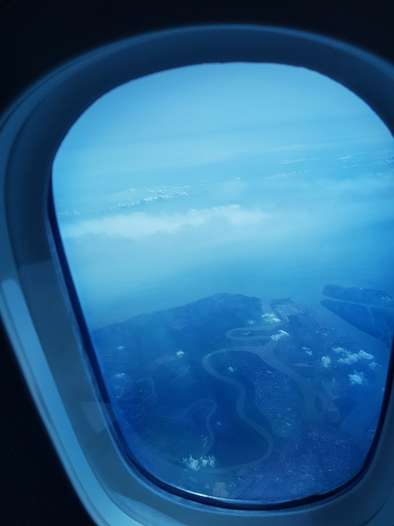 Dann begann allerdings auch der Abstieg nach Chengi Airport. Während des Fluges sprang die ursprünglich genannte Ankunftszeit von 16:05 Uhr auf 16:40, denn wir mussten zwei Gebiete umfliegen, wo schlechtes Wetter herrschte. Auch so gab es einige Turbulenzen, aber nix dramatisches. Erste Blicke auf den Inselstaat Singapur.