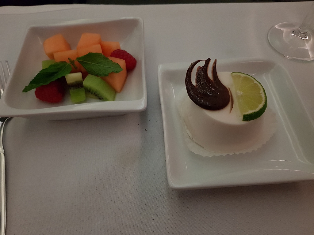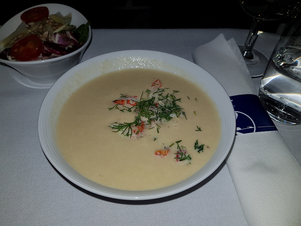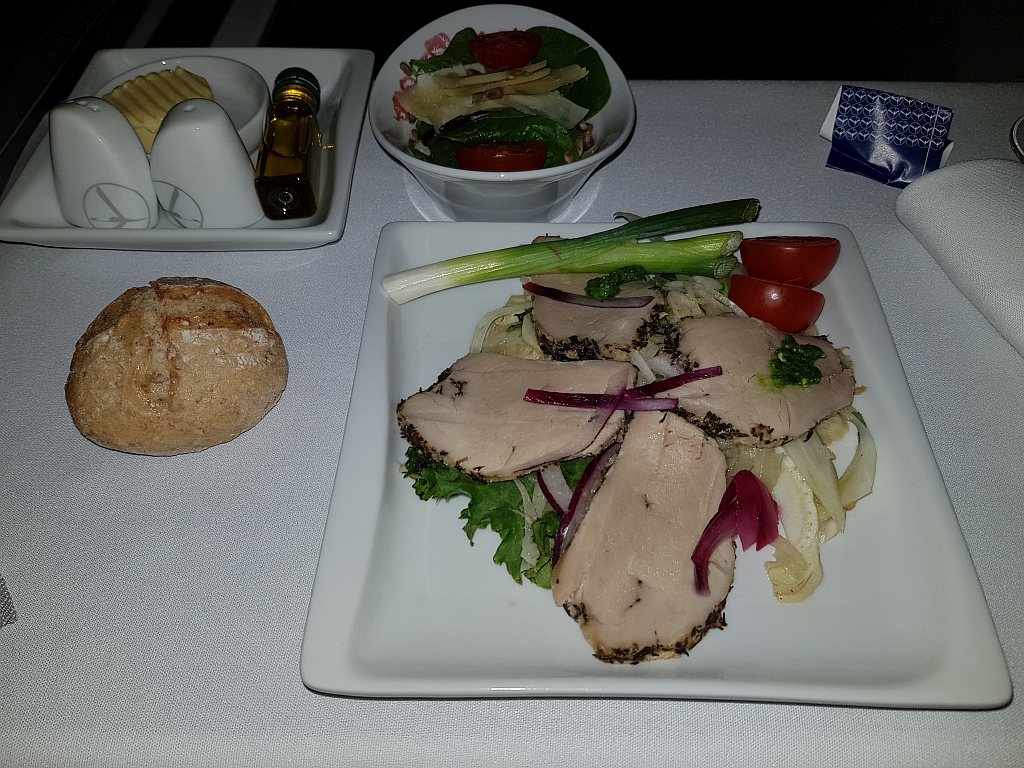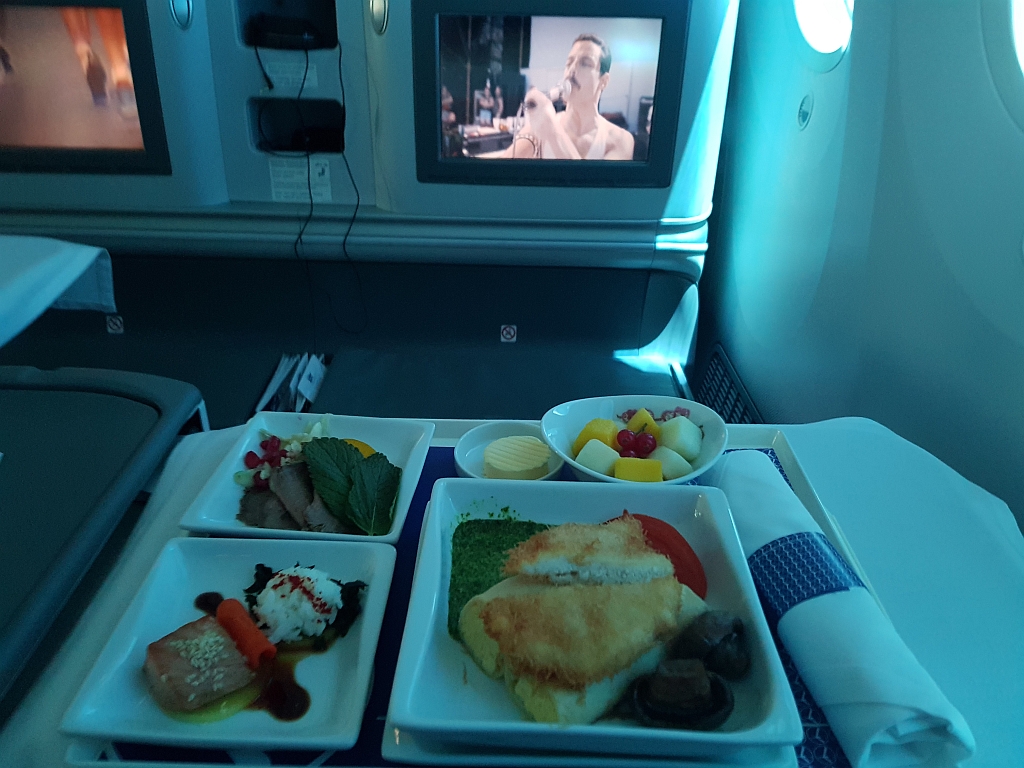 Auf Reiseflughöhe angekommen, begann für einige in der voll besetzten Business Class das späte Abendessen / der Mitternachts-Snack.