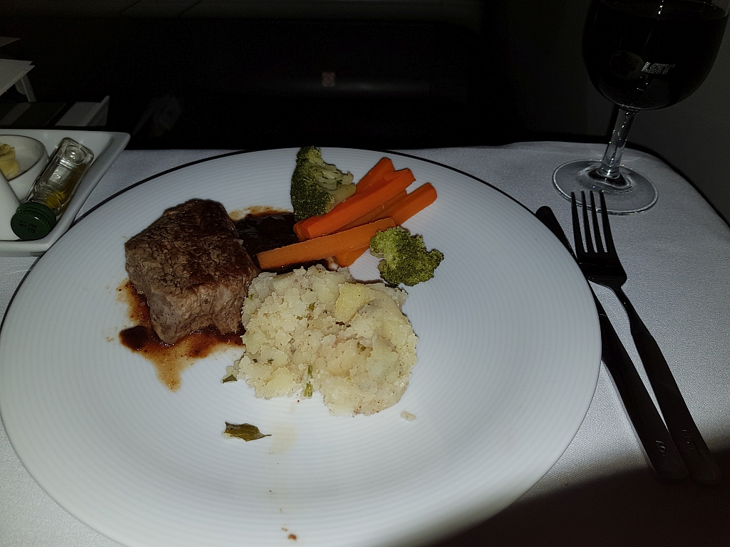 Der Fisch war, genau wie die beiden Vorspeisen, waren sehr gut. Das Steak … naja, sagen wir mal so: Da wollte die Crew wohl sichergehen, dass es auch wirklich tot ist!