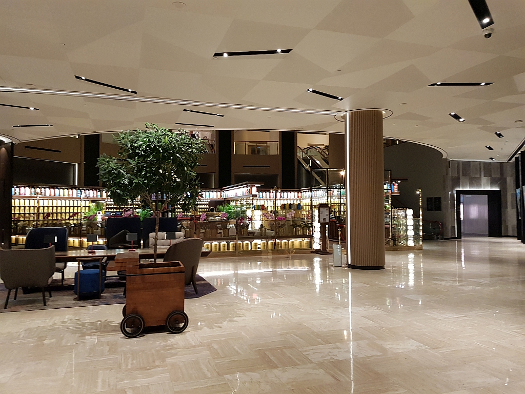 Völlig übermüdet geht es durch die total überfüllte Hotellobby …